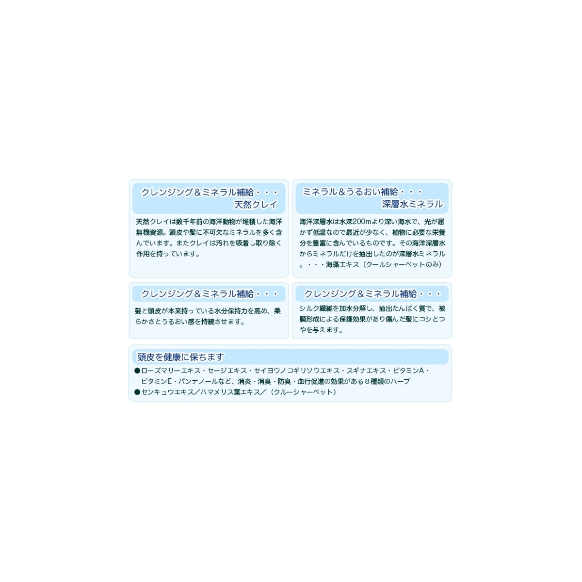 水・セテアリルアルコール・シクロメチコン・ベヘントリモニウムクロリド・ジメチコン・スクワラン・ステアリン酸グリセリル・タナクラクレイ・海塩・加水分解シルク・トコフェノール・ピーナッツ油・パルミチン酸レチノール・パンテノール・ローズマリーエキス・セージエキス・セイヨウノコギリエキス・スギナエキス・ミツガシワエキス・シラカバ樹皮エキス・イラクサ葉エキス・フキタンポポエキス・ジアルキル(C12-18)ジモニウムクロリド・PPG-9ジグリセリル・イソプロパノール・ヒドロキシプロピルセルロース・エチルセルロース・PG・BG・(酸化鉄/酸化チタン)焼結物・酸化鉄・ポリエチレン・メチルパラペン・プロピルパラペン・香料