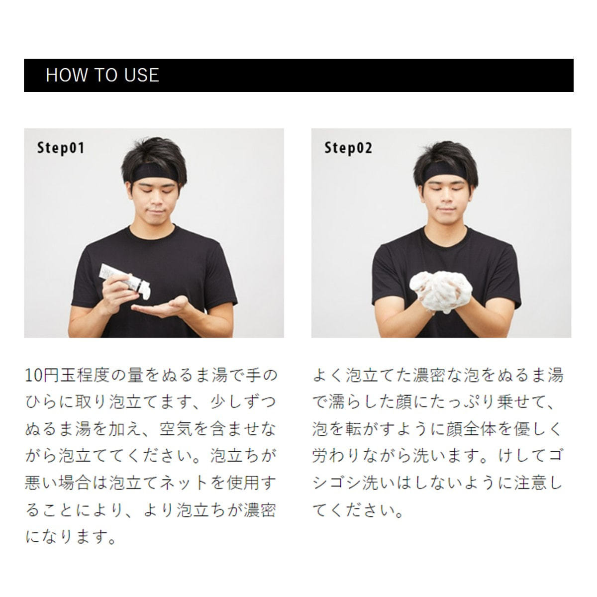 ①10円玉程度の量をぬるま湯で手のひらに取り泡立てます、少しずつぬるま湯を加え、空気を含ませながら泡立ててください。