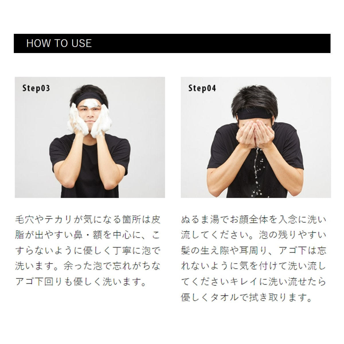 ④ぬるま湯でお顔全体を入念に洗い流してください。